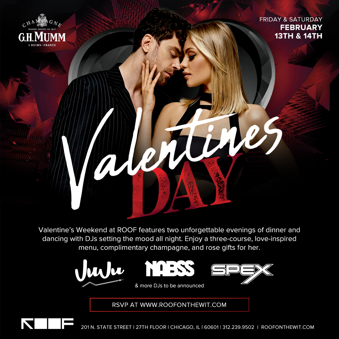 Turn up the heat this Valentine’s Weekend at ROOF on theWit, Chicago’s iconic rooftop lounge. Featuring two unforgettable evenings of dinner and dancing, DJs set the mood all night against breathtaking skyline views. Guests will enjoy a three-course, love-inspired menu, complimentary champagne, and rose gifts for her, all designed to elevate the experience. Whether you’re celebrating with a partner or just here for the vibe, expect great music, crafted cocktails, and a night that goes well beyond the clichés.
